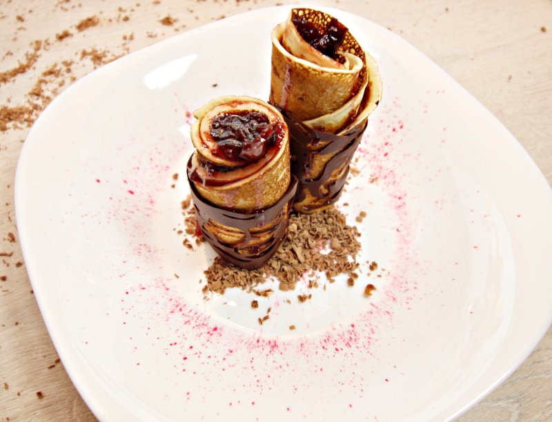 Intr-un bol, amestecam ingredientele uscate (faina, zaharul vanilat si praful de sare). Cernem compozitia uscata o singura data. Separat trebuie sa mixam cele 2 oua cu laptele si esenta de vanilie. Omogenizam bine. Turnam amestecul lichid peste amestecul cu ingrediente uscate. Mixam bine. Daca aluatul este prea gros, atunci mai adaugati lapte. (aluatul trebuie sa ramana mai gros decat la clatitele traditionale). Ungem tigaia de clatite cu un servetel sau un buretel imbibat in ulei. Asa trebuie sa procedam dupa fiecare clatita. Cu un polonic turnam usor compozitia in centrul tigaii. Lasam clatita aproximativ 1 minut la foc mediu, iar apoi o intoarcem pe partea cealalta. Le rulam, apoi turnam dulceata de visine si toppingul de ciocolata. Eu le-am prezentat imbracate in ciocolata topita. Am topit ciocolata la bain-marie, am pus-o intr-un pos si am inceput sa ma joc cu ciocolata pe bucatele de hartie de copt. Le-am lasat la frigider sa se raceasca aproximativ 3 minute, iar apoi le-am rulat pe clatite si le-am pus din nou in frigider. Dupa 5-6 minute le-am scos si am desfacut hartia de copt).