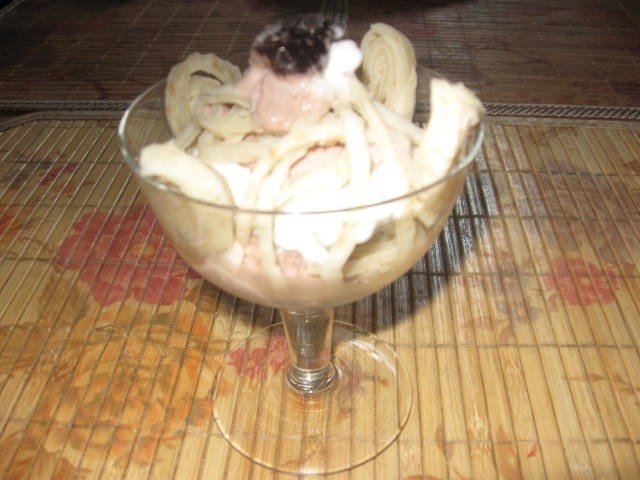 Clatitele se ruleaza si se taie fasii exact ca taiteii . Se aseaza fasiile de clatite pe marginea cupei pastrand o parte din margini in afara cupei. De asemenea se aseaza fasii de clatite si pe fundul cupei,dupa care se adauga putina inghetata, topping de fructe sau ciocolata, din nou fasii de clatite, inghetata,topping de fructe sau ciocolata si se aduc fasiile de clatite de pe marginile cupei formandu-se un mic turnulet ,iar de jur imprejur se aseaza bucati de clatite.