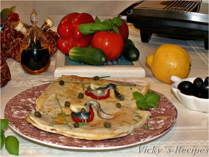 -Se ridică placa superioară a aparatului și se întinde jumătate din compoziția de ton și capere, pe jumătate de clătită.