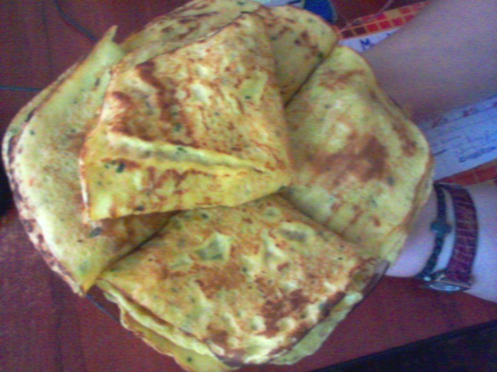 Pentru clatite - se bat bine ouale,apoi adaugam laptele, cartofii (scursi de amidon), faina (cat cuprinde), sare, delikat si curry (se pot adauga si 4-5 linguri de ulei) si la urma verdeata. Se amesteca bine toate ingredientele pana se omogenizeaza si se coc pe ambele parti.