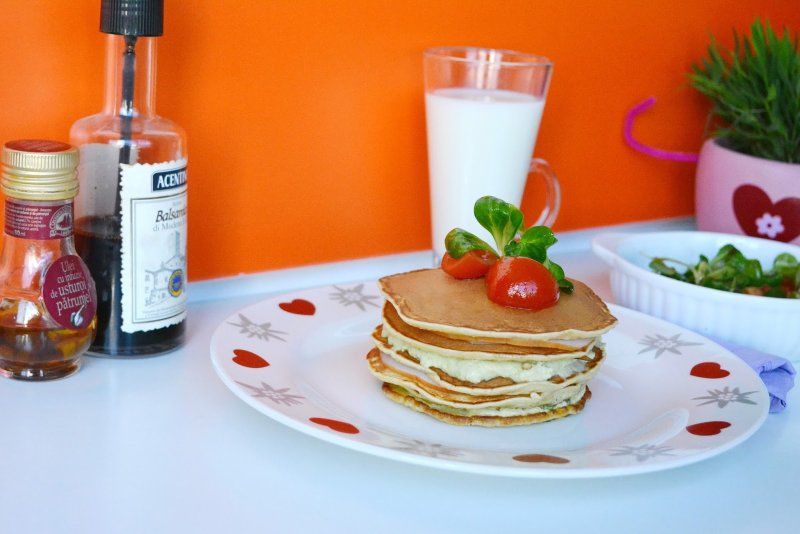 Pentru asamblare: pe o farfurie punem prima clatita, adaugam 1 lingura plina de crema de branza cu avocado, asezam o alta clatita, peste o felie de cascaval plus o felie de sunca, alta clatita, crema de branza, clatita, cascaval plus sunca, clatita. Facem un turnulet mic din clatite suprapuse...Servim cu salata facuta din valeriana si rosii cherry asezonata cu sare, piper, ulei de masline si otet balsamic.