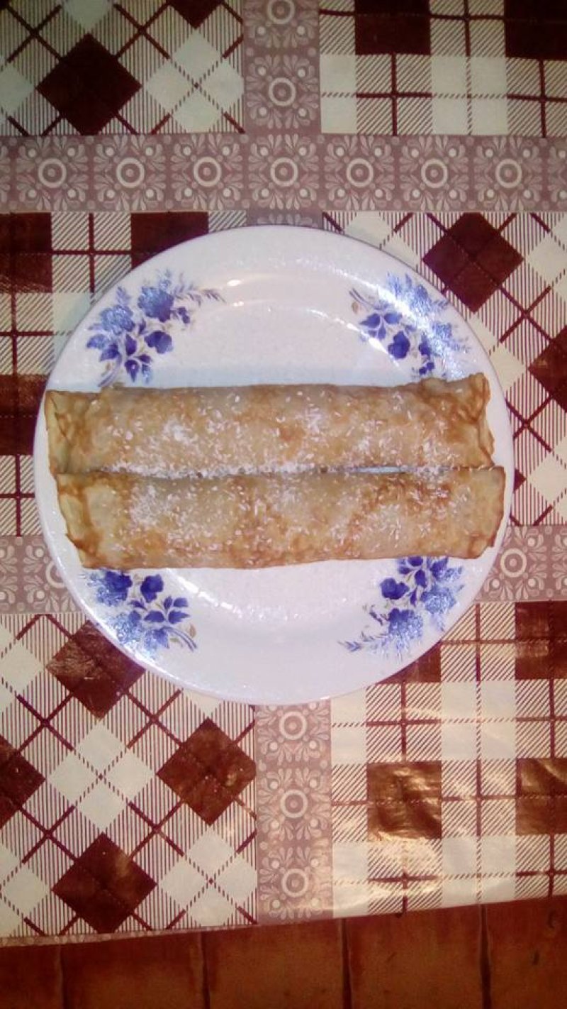 Pentru prezentare, am umplut clatitele cu dulceata de gutuisi am presarat nuca de cocos peste ele.
