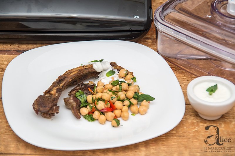 Serviti coastele de miel cu naut amestecat cu patrunjel verde tocat si suvite sau bucatele de ardei kapia copt si conservat in otet.