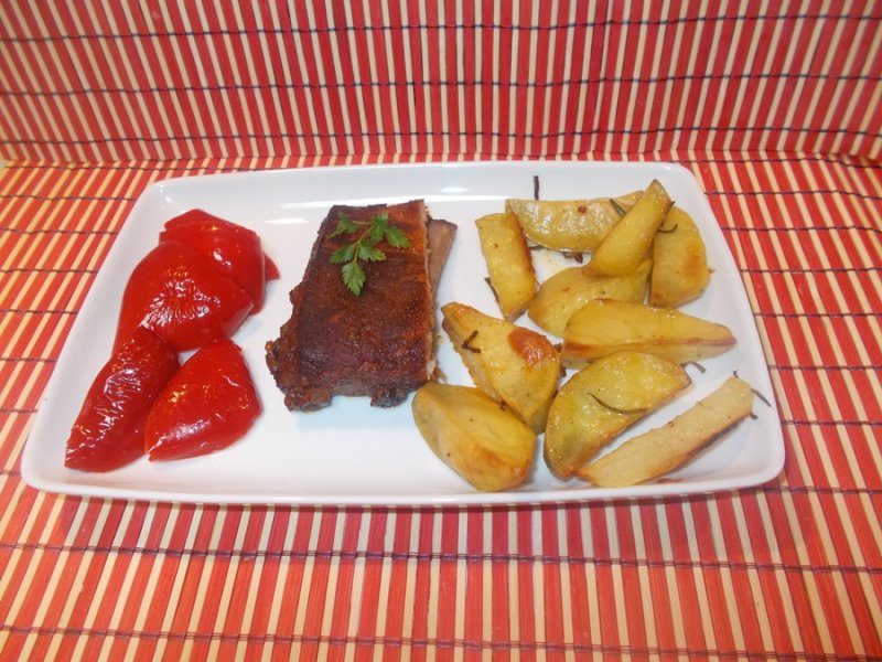 Cartofii curatati ii taiem in 4, apoi ii amestecam cu ulei, sare, piper, rozmarin si usturoi. Ii punem pe hartie de copt in tava si impreuna cu coastele ii dam la cuptor la 180 de grade C, pentru o ora, o ora 1/2, pana s-au copt cartofii si intra furculita usor in coaste. Scoatem cartofii daca sunt gata, iar coastele le ungem cu glazura pe o parte si le mai lasam 20 de minute, apoi le glazuram si pe partea cealalta si le mai lasam inca 20 de minute sa se rumeneasca.