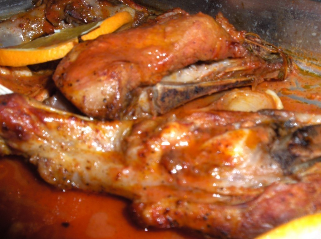 2)Se pune carnea in forma pt. cuptor, impreunã cu vinul, sucul de la o portocalã si uleiul de mãsline.