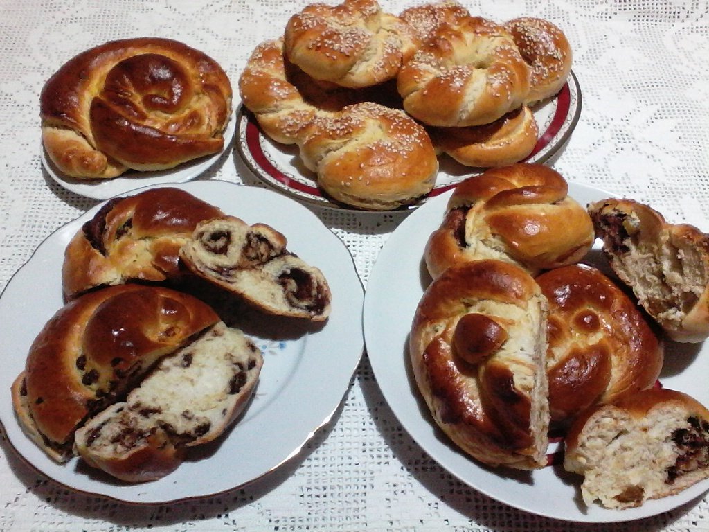 Apoi rupem cu mana bucatele pe care le întindem, apoi le umplem, le rulam si apoi le innodam. Le punem in tava unsa si le lasam sa creasca 30 de minute, acoperite. Apoi le ungem cu ou batut, presaram susan si in, si le coacem pentru 15-20 minute, la 220 de grade C.