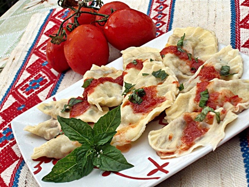 Se pune cate o lingurita de umplutura pe fiecare disc de aluat, se unge marginea cu apa rece apoi se aduce margine peste margine (ca un portofel) si se lipeste presand cu o furculita sau ajutandu-ne de forma speciala.