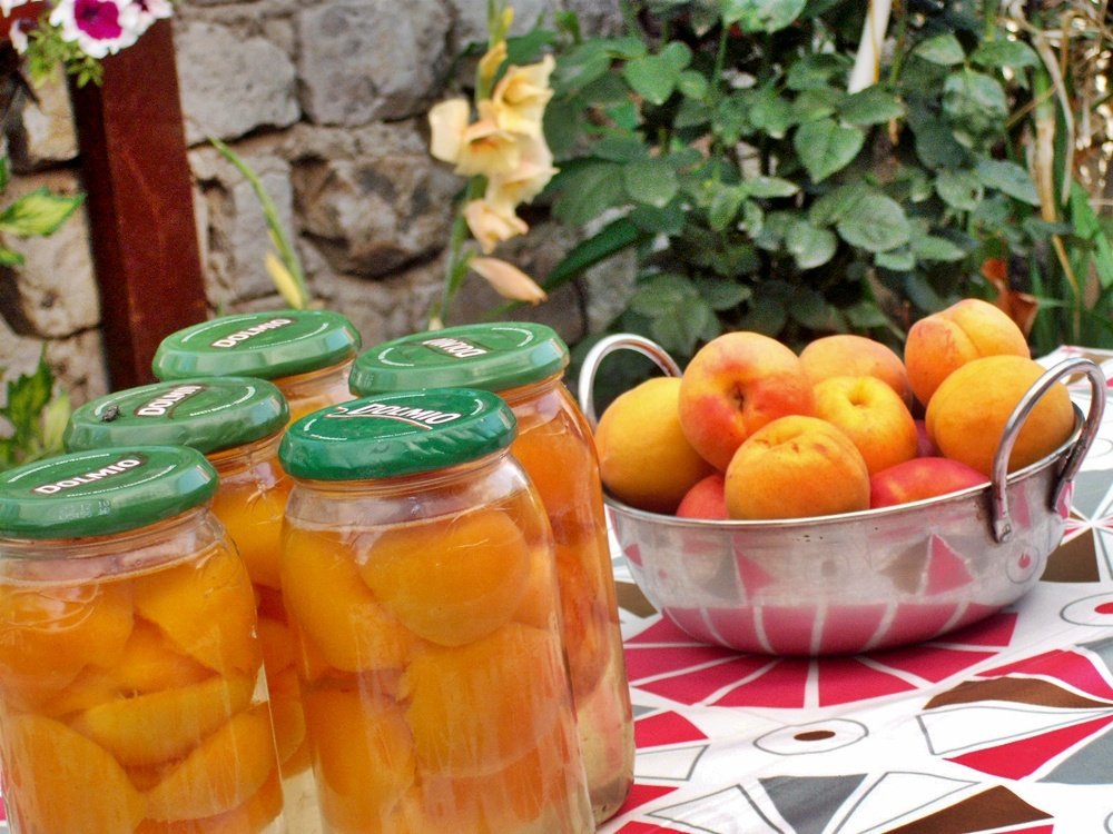 Fructele spalate bine, se desfac in doua sau se taie felii (dupa caz), se elimina samburii si se asaza in straturi, unele peste altele, in borcane curate si scurse bine, mai mult de jumatatea borcanului, apoi se presara cate 5 linguri de zahar/borcan de 800 ml (borcan mai mare) si apoi se completeaza cu apa, pana se umple borcanul.