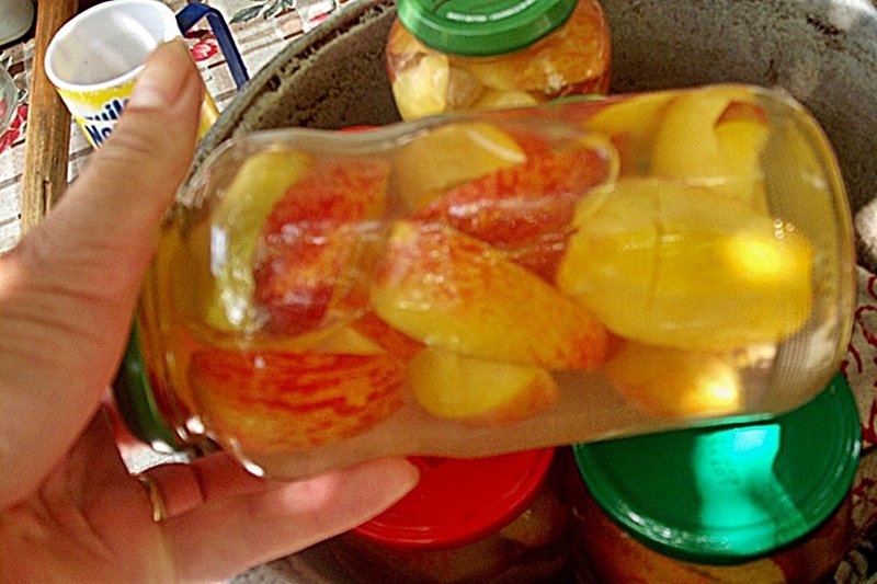 In borcanele curate si uscate se pun cate 4 linguri de zahar, apoi felii subtiri (desprinse de pe sambure cu un cutit) de piersica de la 3-4 fructe. Se umple borcanul cu apa, se infileteaza bine. Intr-o cratita pe fundul careia am pus o carpa de bumbac, se asaza unul langa altul, se toarna apa pana la buza borcanelor si se fierb bine, cam 50 de minute, pana ce zeama compotului devine roz.