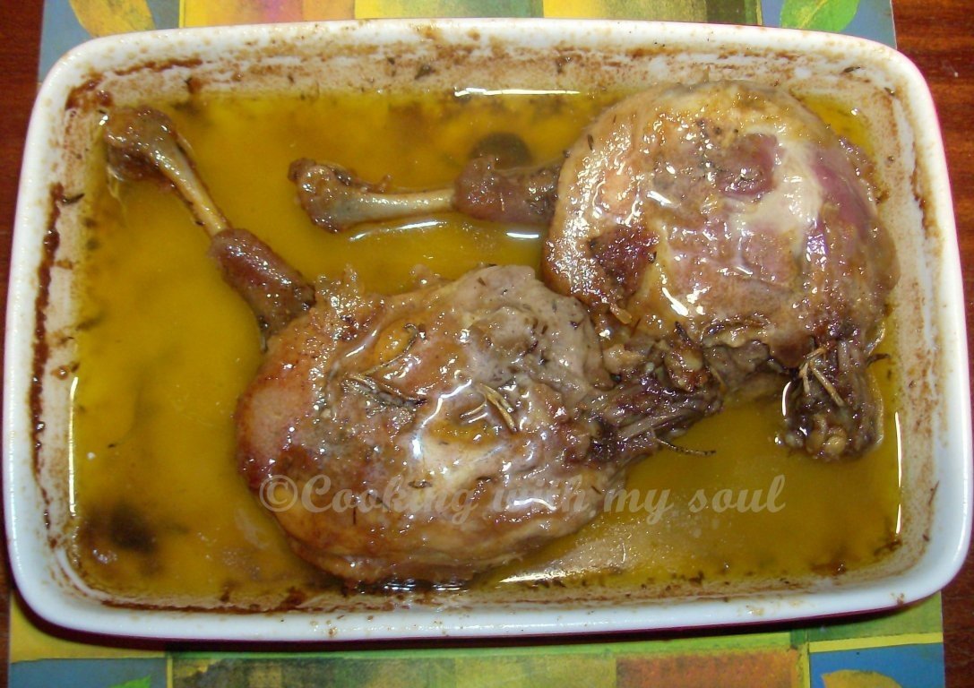 * A doua zi: Incalzeste cuptorul la 190 C (mediu). Sterge bine pulpele de sare si pune-le intr-o tava pentru cuptor. Pe ele pune usturoiul, rozmarinul si cimbrul. Toarna uleiul deasupra, ca sa le acopere