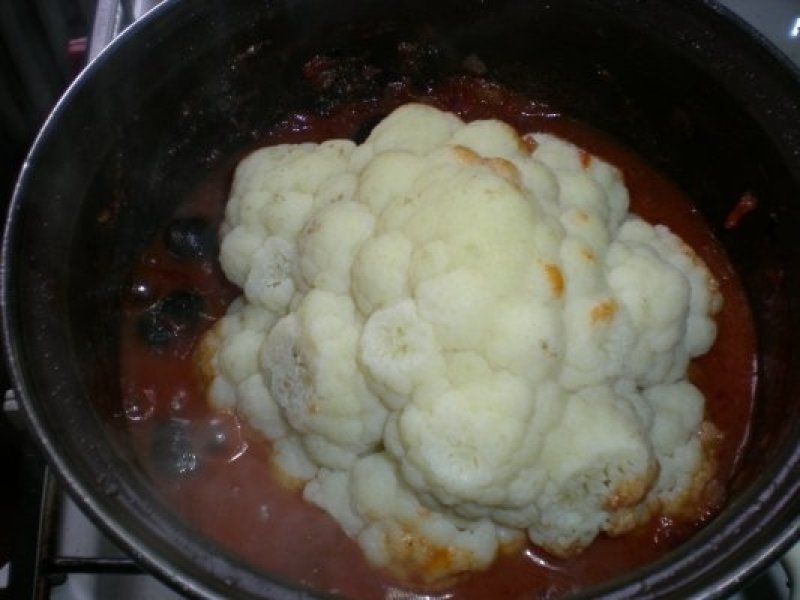 Dupa ce conopida a fiert, se scoate cu atentie intreaga din oala si se pune in sosul de rosii, otet, cepa si masline. Se mai lasa 10 minute pe foc. La sfarsit se aduga patrunjelul.