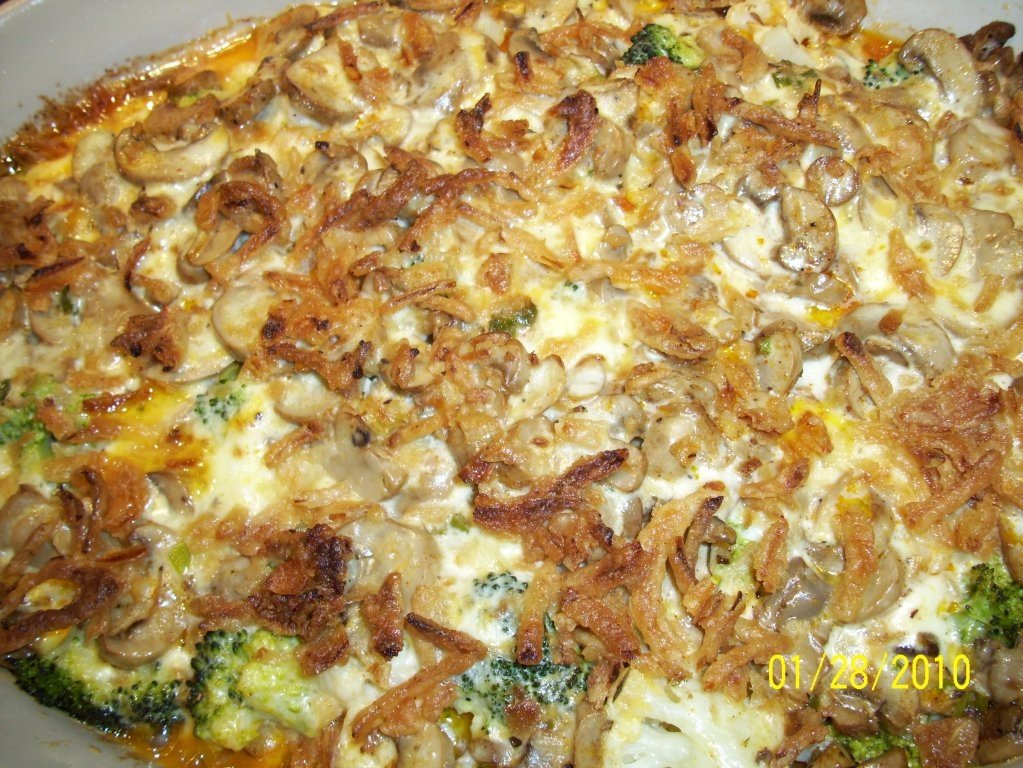Separat in tava data cu spray ptr gatit am pus un strat fried onion, branza si apoi brocoli si conopida pe care le-am oparit putin inainte. Peste am pus branza toate felurile, ciupercile si peste toate am adaugat oule batute cu smantina, iaurtul si putina branza(imi place branza mult).