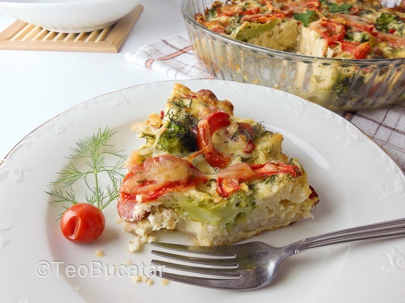 Ardeiul tocat marunt, mararul, usturoiul si carnaciorii se pun in vas peste conopida si broccoli. Se adauga mixul de oua si branzeturi si se orneaza cu felii de rosii.