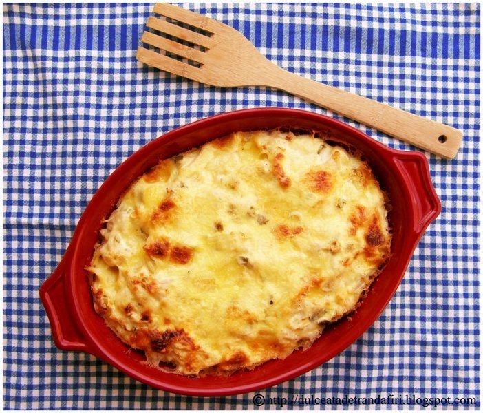 Ceapa o tai marunt, cascavalul cubulete, ouale le amesteci cu smantana. Dai drumul cuptorului, sa fie deja incalzit, la 180 de grade.