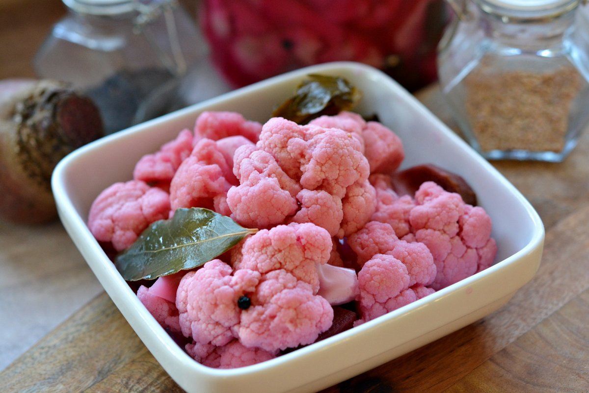 Reteta de conopida murata cu sfecla rosie. Conopida murata cu sfecla rosie reteta simpla. Conopida roz murata cu sfecla rosie la borcan. Conopida murata in saramura. Conopida murata. Retete de muraturi.