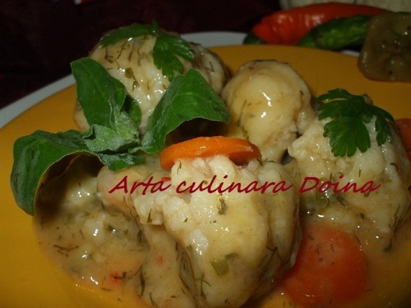 Preparati sosul din unt, faina si dupa ce le amestecati usor pe foc turnati zeama ramasa in vasul de fiert in aburi, amestecand energic cu un tel micut. Dupa 2-3 minute dregeti gustul cu boia, sare, piper, zahar si adaugati mararul tocat. Veti obtine un sos putin roz cu gust de conopida si marar. Cine doreste poate sa dreaga sosul cu o lingura de smantana, eventual cu una-doua lingurite de otet.