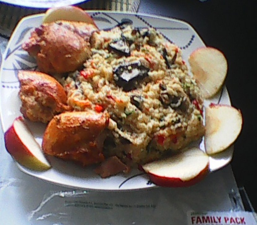 Copanelele se servesc cu garnitura de orez cu legume. Se pot adauga felii de mar langa orez.