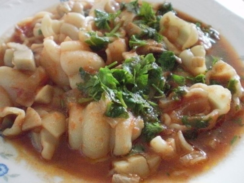 Dupa ce au fiert pastele, se scurg de apa, se adauga sosul de rosii, ceapa si ciupercile. Se amesteca, dupa care se poate servi.