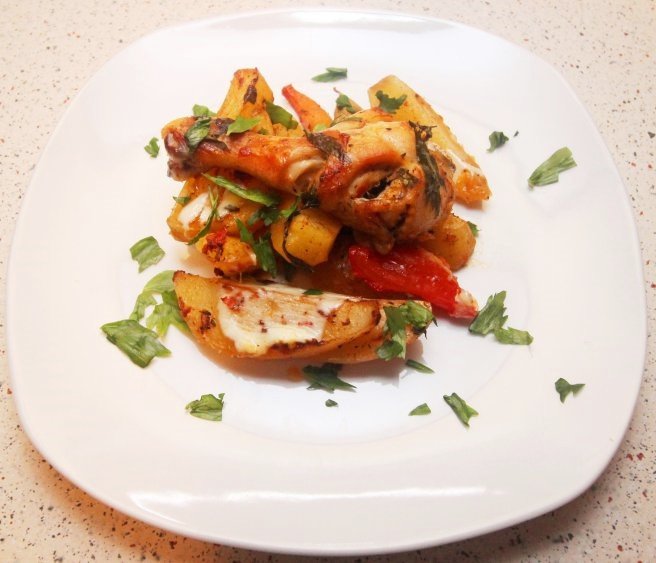 Toate legumele se curata si se spala bine. La fel se procedeaza si cu carnea de pui.Incingem cuptorul la 175 grade. Curatam cartofii si ii taiem in bucati potrivite. Punem cartofii intr-un castron si adaugam 3 linguri ulei de masline iar apoi adaugam toate condimentele si pasta de ardei. Amestecam bine. Turnam cartofii in tava. Punem copanele intr-un castron si adaugam o lingurita de boia si niste leustean taiat marunt. Amestecam.
