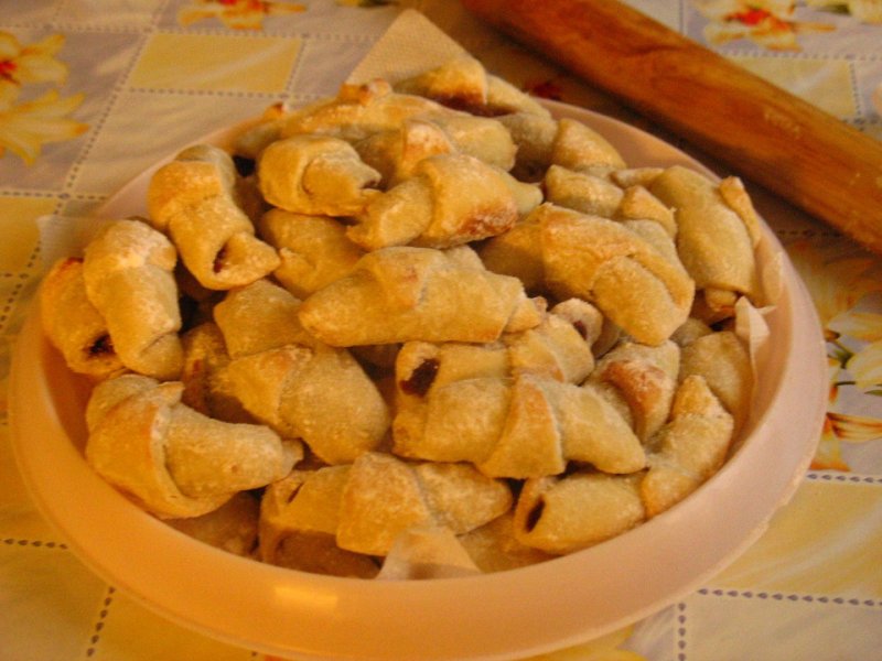 În fiecare ”triunghi” obținut punem umplutura pe care o dorim: rahat tăiate bucățele, gem mai rigid sau amestecat cu nuci pisate. Apoi rulăm cornulețe începând de la baza triunghiului spre vârf.Le așezăm în tavă și dăm tava la cuptor deja încălzit la foc mijlociu.