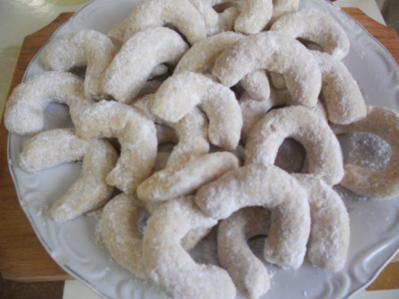 Se amesteca faina,margarina,migdalele macinate si 75 g zahar pana se formeaza un aluat care se pune la frigider 30 minute,dupa care se formeaza betisoare care se taie la dimensiunea de 4 cm.si se indoaie in forma de U.Se pun in tava pe hartie de copt si se introduc in cuptorul preincalzit aproximativ 15 minute.se scot si se trec fierbinti prin zaharul pudra.