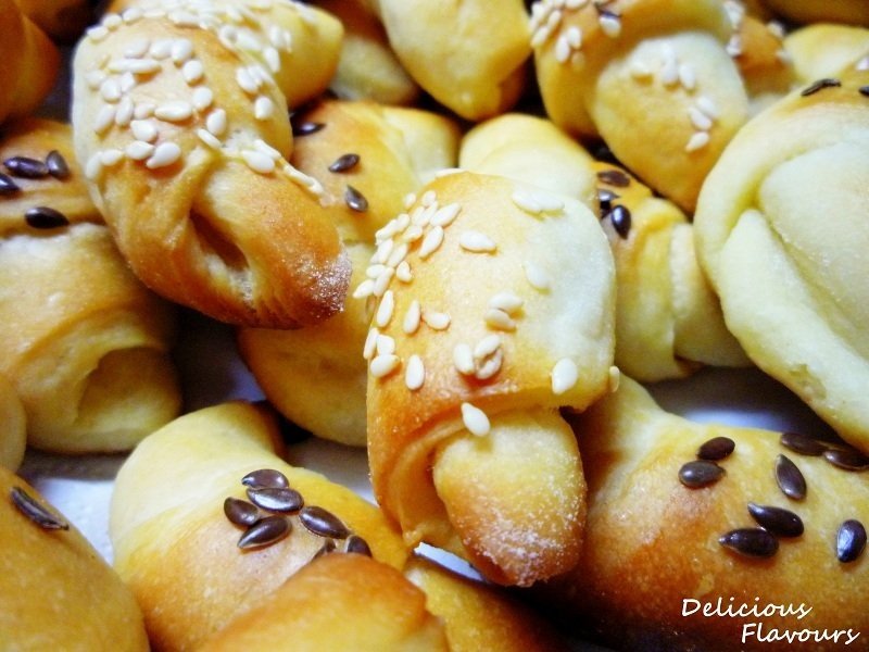 Impartim aluatul in 6 bucati egale si intindem aluatul unul cate unul in forma de cerc. Apoi taiem circa 8 feliute, asezam la baza feliei un cubulet de unt si rulam. Asezam cornuletele intr-o tava tapetata cu hartie de copt, ungem cu albus si presaram cu seminte (susan, chimen, in, etc). Dam cornuletele la cuptorul preincalzit pana capata o culoare aurie, aproximativ 25-30 minute.