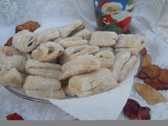 Intr-un bol adaugam faina, zaharul, coaja de portocale le amestecam dupa care facem o gaura in mijloc. Adaugam amoniacul dizolvat in otet, uleiul si treptat apa minerala rece, framantam un aluat omogen si nelipicios.