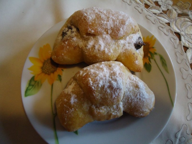 Dupa ce a crescut aluatul,il impart in trei parti egale. Pe o planseta intind un cerc pe care il impart in 8 parti egale. Pe fiecare fasie de aluat, asez cate o lingurita de compozitie de gem. Modelez cornurile pe care le asez pe tava unsa. Las sa mai creasca 20 minute,dupa care la dau la cuptorul incins pana se rumenesc (20-30 minute, in functie de cuptor).La fel procedez cu fiecare din cele 3 parti de aluat.Dupa ce scot tava din cuptor, insiropez cu un penson fiecare corn pe ambele parti. Las sa se zvante pe un sevet de hartie, dupa care le pudrez.