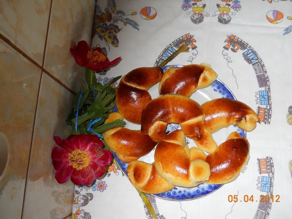 Cand am pofta fac o portie pentru noi ca sa la savuram cu o cana cu lapte la micul dejun. Eu folosesc pentru framantat masina de paine (de aceea trebuie respectata ordinea ingredientelor, mai intai cele umede amestecate separat intr-un castronel, le pui in cuva masinii si apoi se pun cele uscate, adica faina, iar drojdia deasupra fainii). Daca nu aveti se face manual ca si cozonacul.