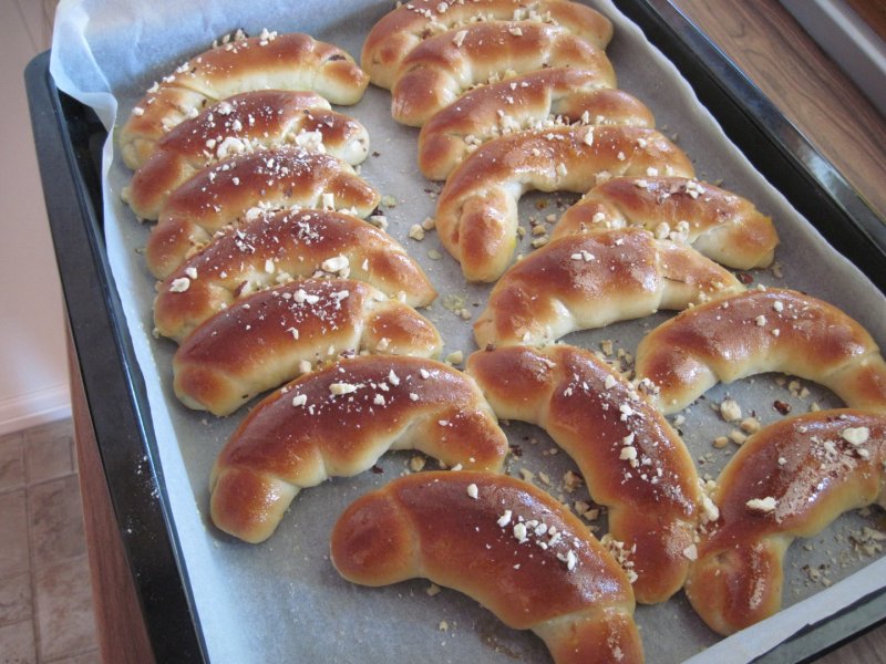 Se scopera bolul cu aluat cu un servet de bucatarie curat si se lasa jumate de ora al crescut, apoi se toarna pe suprafata de lucru unsa cu ulei, facem un sul din aluat si il taiam in bucati egale; ar trebui sa iasa cam 12-14 bucatele; fiecare bucata de aluat o intindem cu sucitorul, punem umplutura preferata pe ea si rulam. Asezam toate cornurile formate in tava si mai lasam 20 min la crescut,apoi dam la cuptor pana devin rumene.