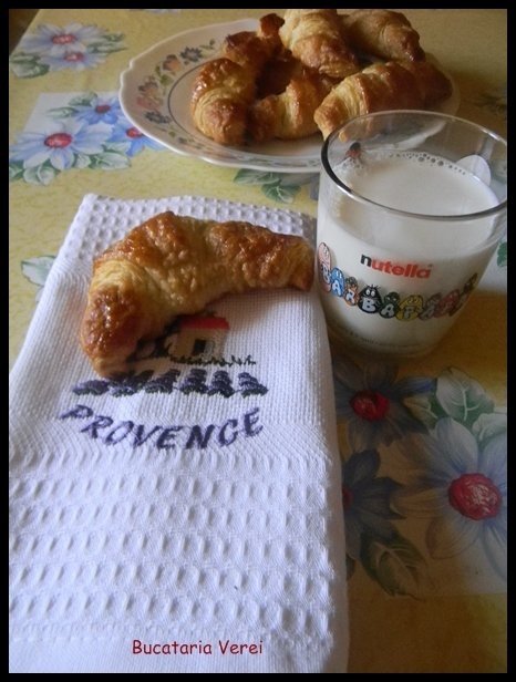Pe fiecare triunghi am pus o lingura de nutella ,am rulat si am obtinut 8 cornuri pe care le-am uns cu ou batut si presarat cu zahar tos;