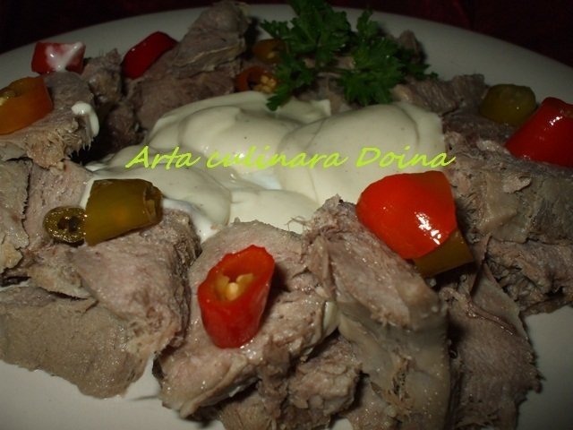 Curatati limba de piele, taiati-o felii de 5-8 mm grosime si asezati feliile pe un platou sub forma de coronita ca sa ramana in mijloc un cuib in care veti turna sosul. Garnisiti cu peperoni si patrunjel verde.