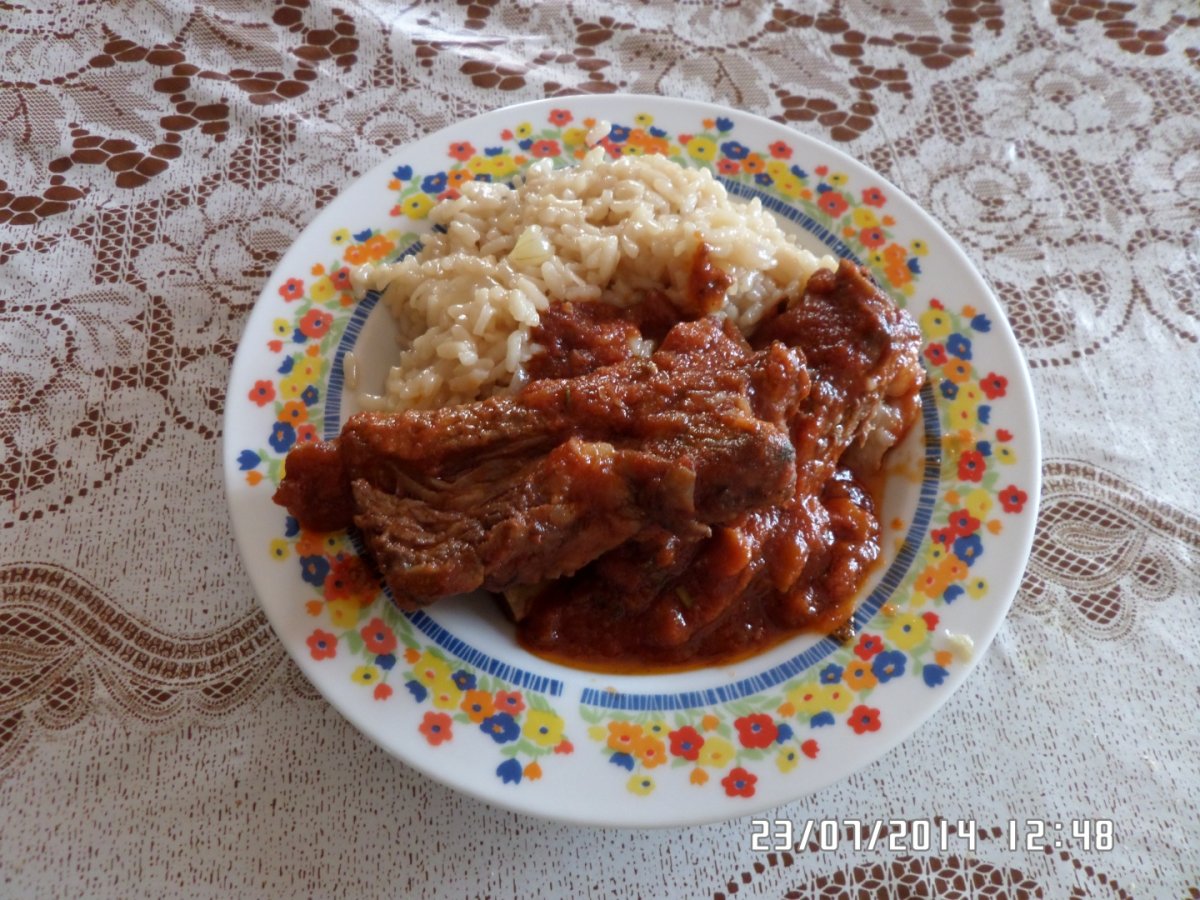 Lasam circa 1-2 minute sa se evapore alcoolul, dupa care adaugam frunza de telina, rozmarinul, foile de dafin si sucul de rosii. Amestecam bine, acoperim cu un capac si lasam sa fiarba la foc potrivit pentru circa o ora, pana cand carnea incepe sa se desprinda de oase. Cand carnea este fiarta, adaugam boabele de coriandru pisate, potrivim de sare si piper. Amestecam bine, acoperim iar cu capacul si lasam sa mai fiarba inca 3-4 minute, dupa care mancarea este gata.