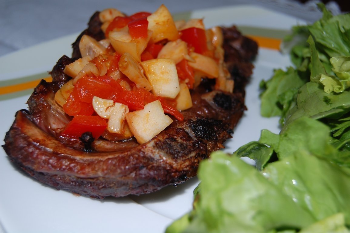 Se scoate costita din cuptor, se taie in doua si apoi se aseaza pe farfurii. Se acopera cu salata calda. Noi am servit si cu salata verde stropita cu ulei de masline si otet.