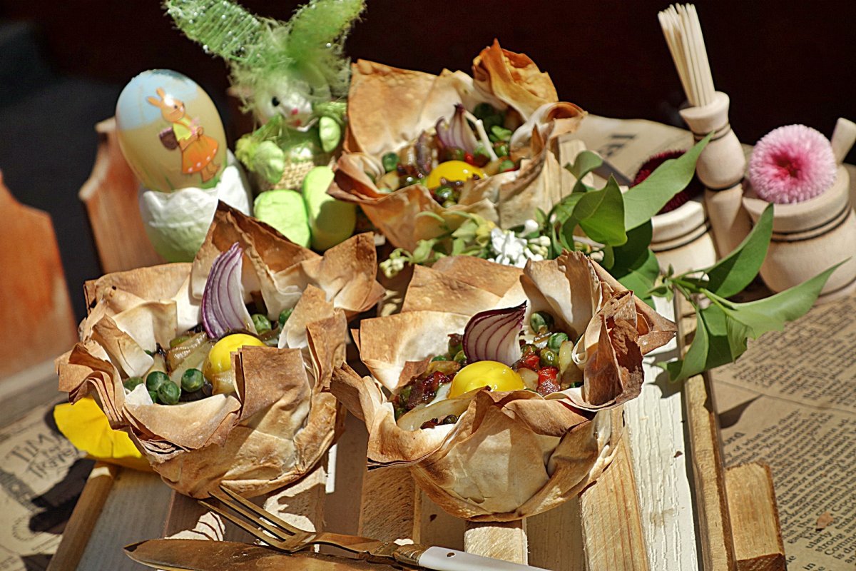 Asezam patratele de foi de placinta intr-o forma de briose astfel incat sa formam un cosulet cu mai multe colturi si suprapunem minim 4 patrate in care vom pune umplutura de legume calite, vom sparge cate un ou de prepelita si vom da la cuptor cca 15-20 minute, la foc domol,pana se rumenesc cosuletele frumos si oul capata crusta. Se mananca ca si aperitive calde dar si reci, sunt delicioase!