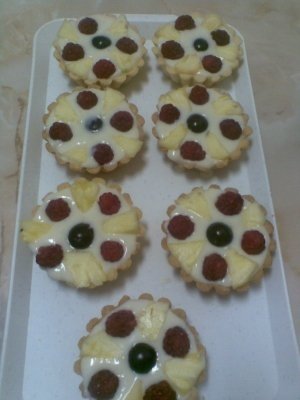 Se amesteca oualele cu zaharul,sarea si faina cu putin lapte rece-200ml.Separat se pune restul de lapte la fiert intr-o oala cu peretii dublii si cand a dat in fiert se toarna compozitia de oua in fir subtire amestecand continu.La urma se pune vanilia(daca aveti baton de vanilie,taiati-l pe lungime, scoateti semintele si le puneti in lapate) se adauga untul si se ia crema de pe foc.Se lasa sa se racesca foarte bine.Cu aceasta crema se umple cosuletele si se orneaza cu fucte de sezon,sau dupa gustul fiecaruia.
