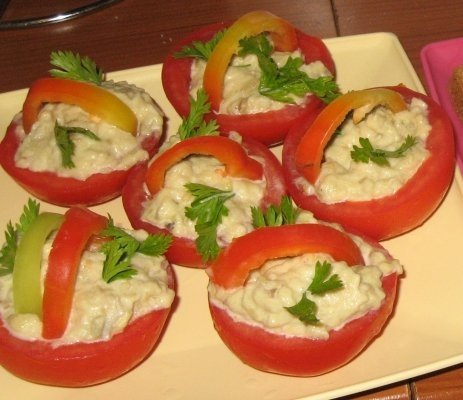 Se umplu rosiile cu salata de vinete sau cu branza de vaci cu ceapa si marar.