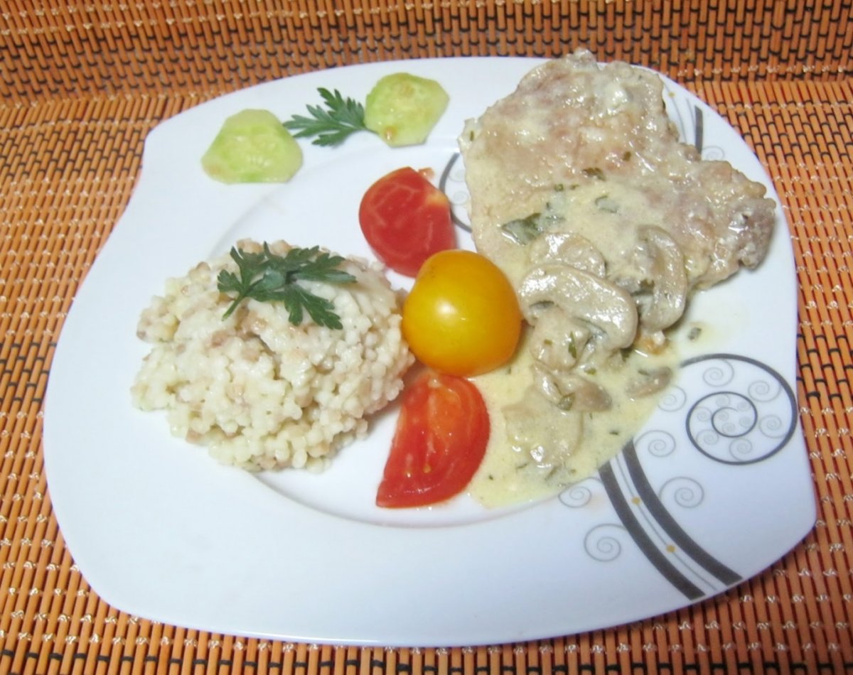 Servim cotletul cu sos ,alaturi de cus-cus si o salata de rosii si castraveti.