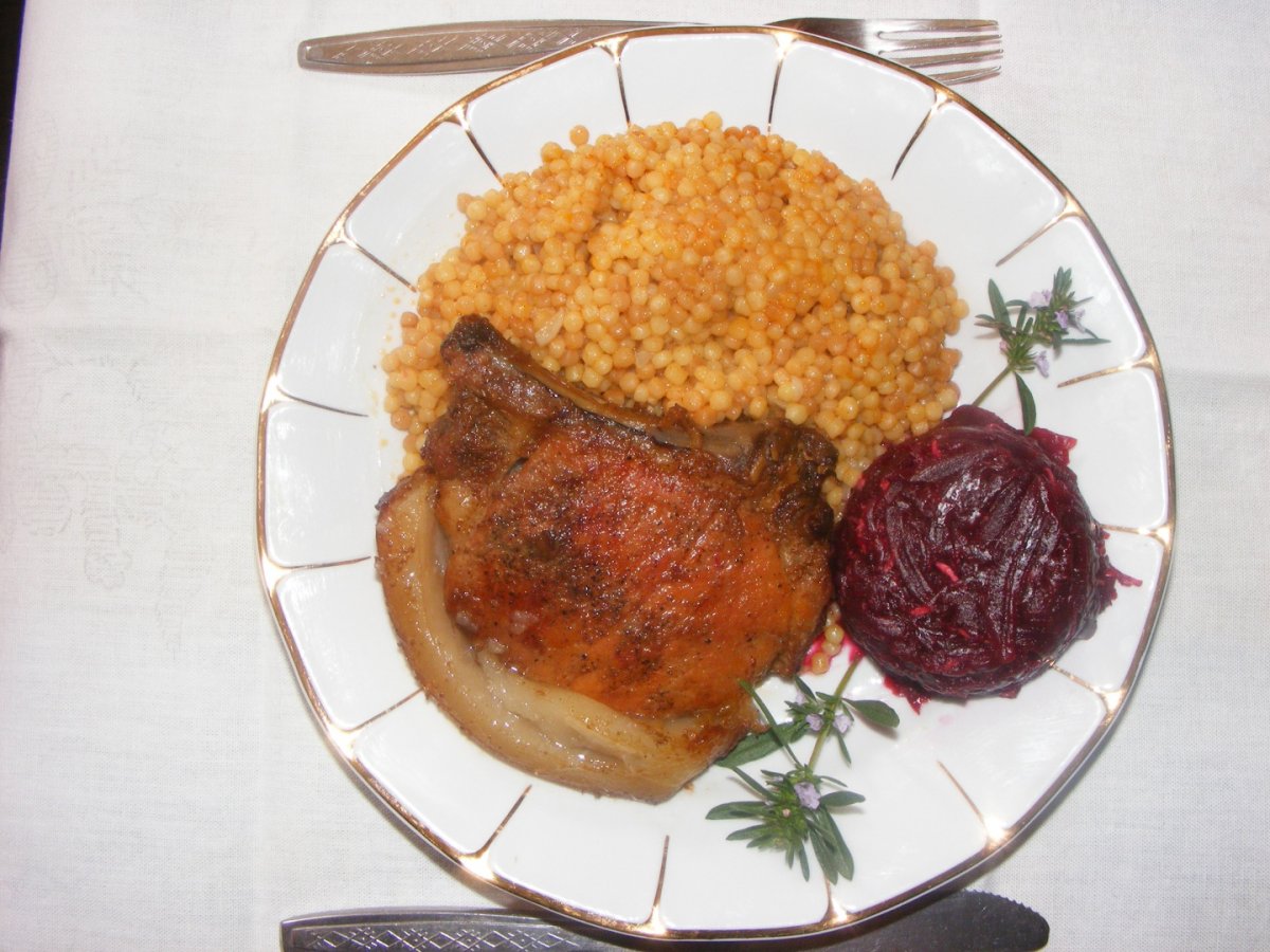 La garnitura, calim ceapa taiata marunt in ulei adaugam boiaua , cuscusul, sarea se amesteca de cateva ori, apoi turnam apa, se lasa sa se fiarba 10 minute se stinge focul si se acopera cu un capac, va absorbi toata apa ramasa. Se mai sareaza daca este cazul.