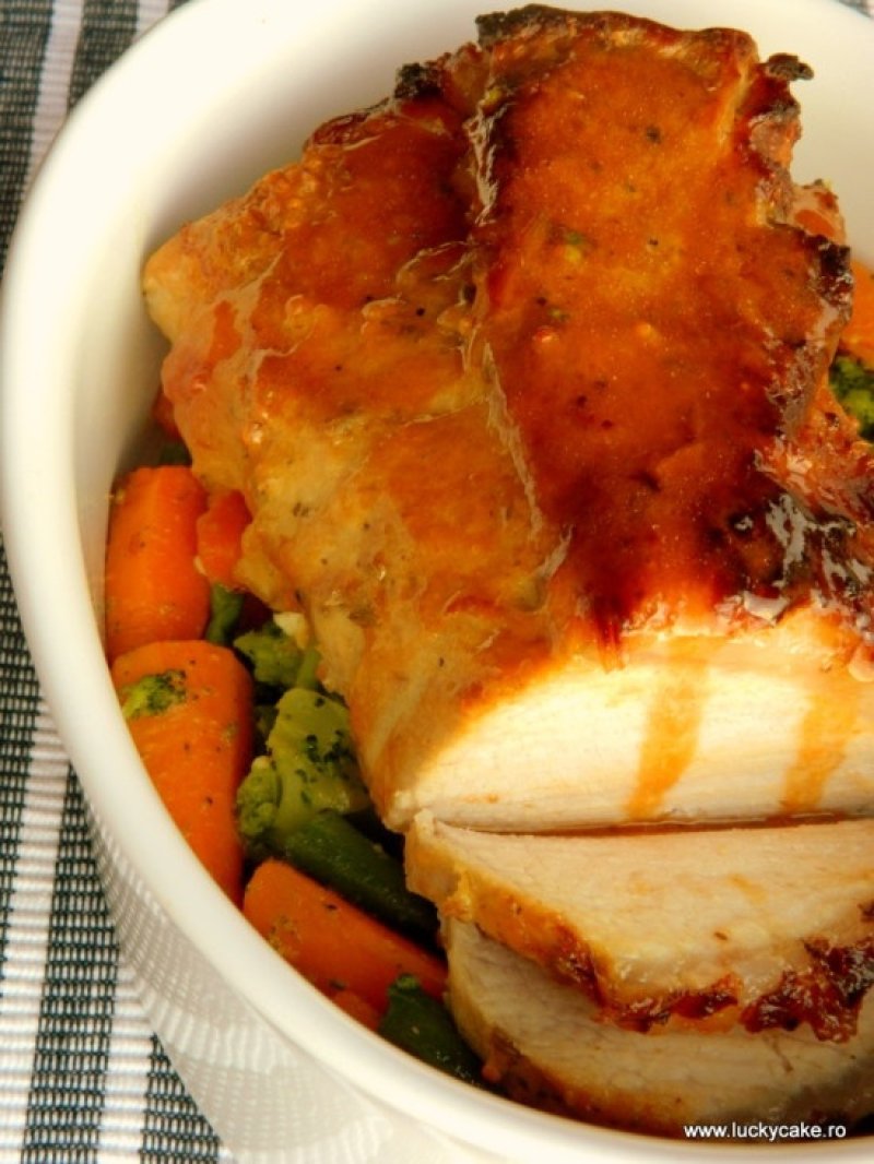 Intr-o tigaie cu maner metalic incingem 1 lingura ulei de masline. Carnea o saram bine, apoi o rumenim bine in tigaia incinsa (dureaza cam 5 minute). Apoi il glazuram cu amestecul de miere, mustar si condimente, turnam in tigaie 50 ml apa si il dam la cuptor timp de 40 minute la 200 grade. La jumatatea timpului, verificam daca nu a scazut prea mult sosul si daca mai trebuie adaugam inca 50 ml apa. Daca aveti termometru de bucatarie, ca sa fie gata carnea trebuie sa aiba 65 grade celsius.