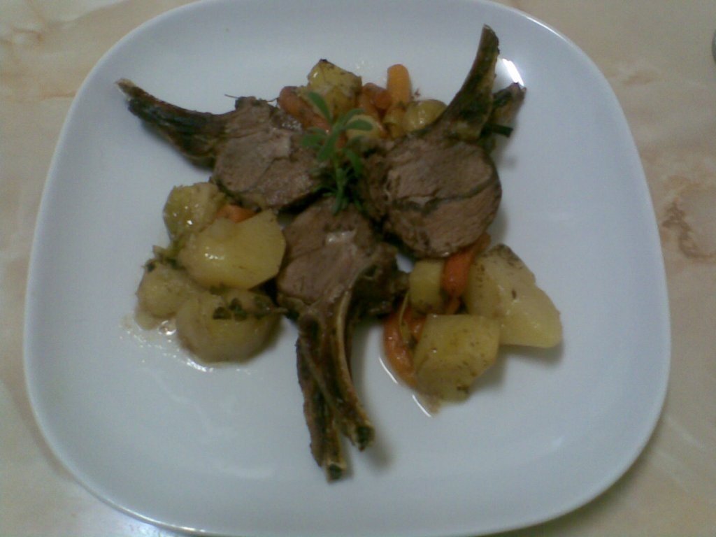Se spala bine coastele si se curata legumele.Apoi cu ajutorul unui cutit inpingem carnea din varful fiecarui os in asa fel incat sa ramana dezgolit pana la jumatate.Condimentam carnea peste tot cu sare,piper,cimbru si frecam costele cu usturoiul zdrobit.Se unesc apoi coastele astfel incat sa obtinem o coronita.Se prind capetele cu scobitoare sau se pot coase.(desii la cuptor la mine s-a desfacut intrucat nu a fost suficient de mare).Coronita astfel obtinuta se aseaza intr-o tava.Mijlocul se umple cu o parte din legumele taiate iar restul se repatizeaza in jurul ei.Se stropeste totul cu o cescuta cu apa si ulei si lasam la cuptor aproximativ 1 ora.Din cand in cand stropim cu sosul format in tava.Spre final adaugam vinul.Mai lasam 20 de minute si gata.Se serveste alaturi de o salata la alegere.