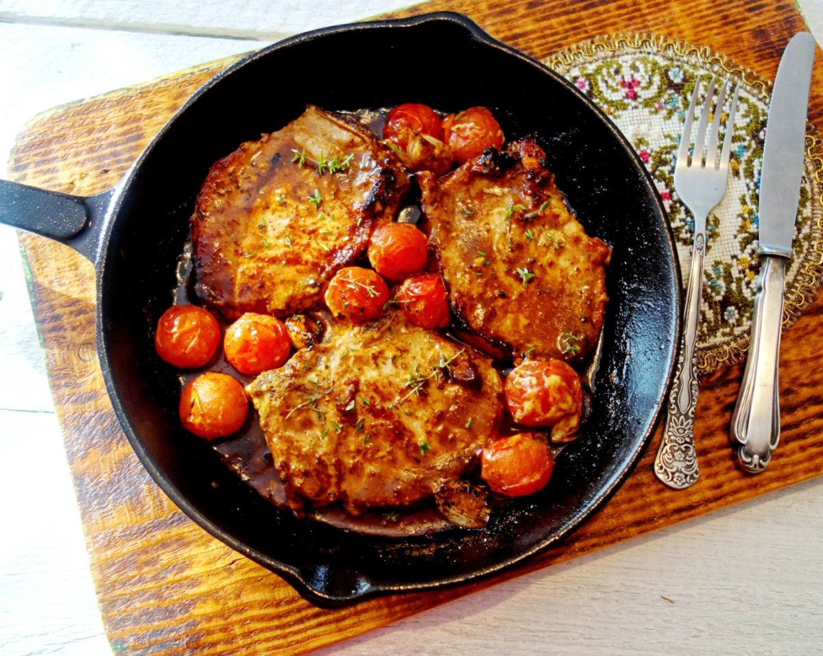 Reteta de cotlete inabusite in unt, cu vin marsala, rosii cherry si usturoi.