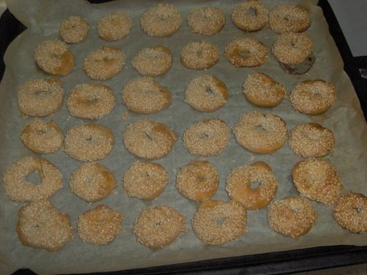 Intr-un castron se cerne faina se adauga margarina bucatele si uleiul si se amesteca si treptat se adauga restul ingridentelor.(se poate pregati aluatul cu robotul de bucatarie si atunci se adauga toate componentele odata). Se incalzeste cuptorul la 180 de grade,se pune pe tava pergament, si se rup bucatele de aluat si se fac covrigei mici.Intr-un castronas se toarna susan si in altul se bate oul cu putina apa.Se inmoaie covrigei in ou si in susan si se pun pe tava.Se coc 12 minute sau pina sint aurii.Se pot pastra intr-o cutie ermetica merg foarte bine cu bere.
