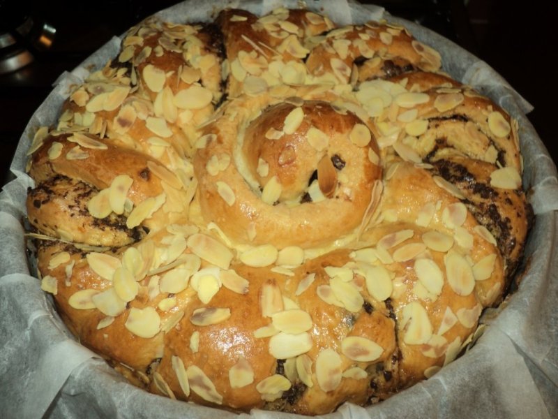 Am uns cozonacul cu galbenusul de ou amestecat cu cele 4 linguri de lapte,apoi am pus fulgi de migdale peste ei si am mai lasat 40 de minute la dospit sa creasca bine. Am copt cozonacul in primele 10 minute la foc mai mare sa creasca apoi am redus la 180 de grade si am lasat 40-45 de minute. El se rumenese repede dar ca sa fie copt sigur in interior, trebuie lasat mai mult si verificat cu scobitoare inainte de a-l scoate. L-am asezat la mijlocul cuptorului si sub tava in care i-am copt am lasat tava mare de la aragaz de protectie, asa procedez cu toate prajiturile si nu se ard niciodata(am invatat de la o matusa).