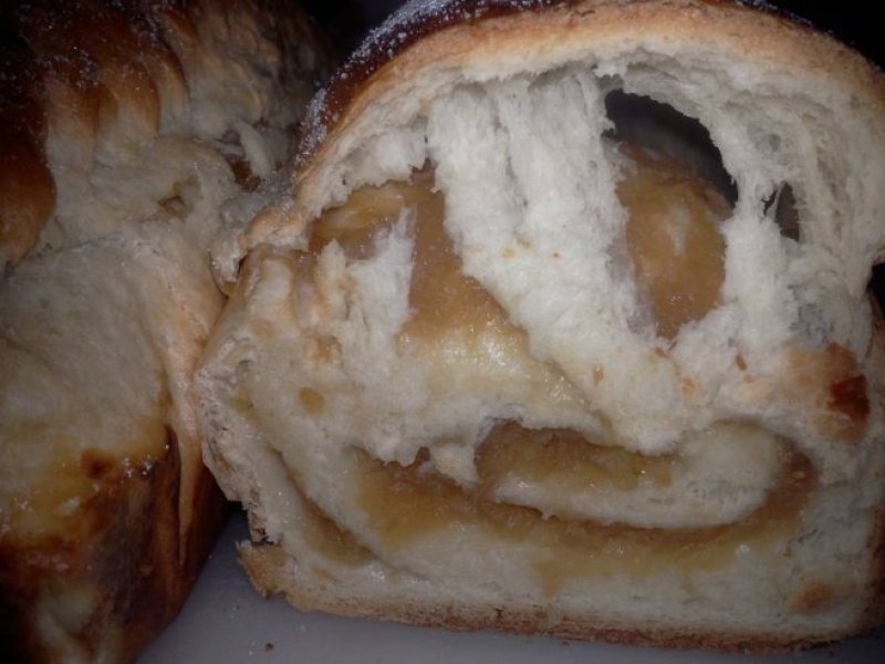 Dupa ce a crescut aluatul, il impartim in 2 si fiecare parte o intindem cu sucitorul (ne ajutam de putina faina pentru a nu se lipi) si punem deasupra foii jumatate din compozitia de mere si rulam de la un capat la altul, asa si pentru jumatatea cealalta. Le punem intr-o tava tapetata cu hartie de copt, le ungem cu oul batut bine si le dam la cuptorul preincalzit pana se rumenesc frumos deasupra. Cand le scoatem din cuptor le ungem cu putina apa si presaram zahar vanilat.