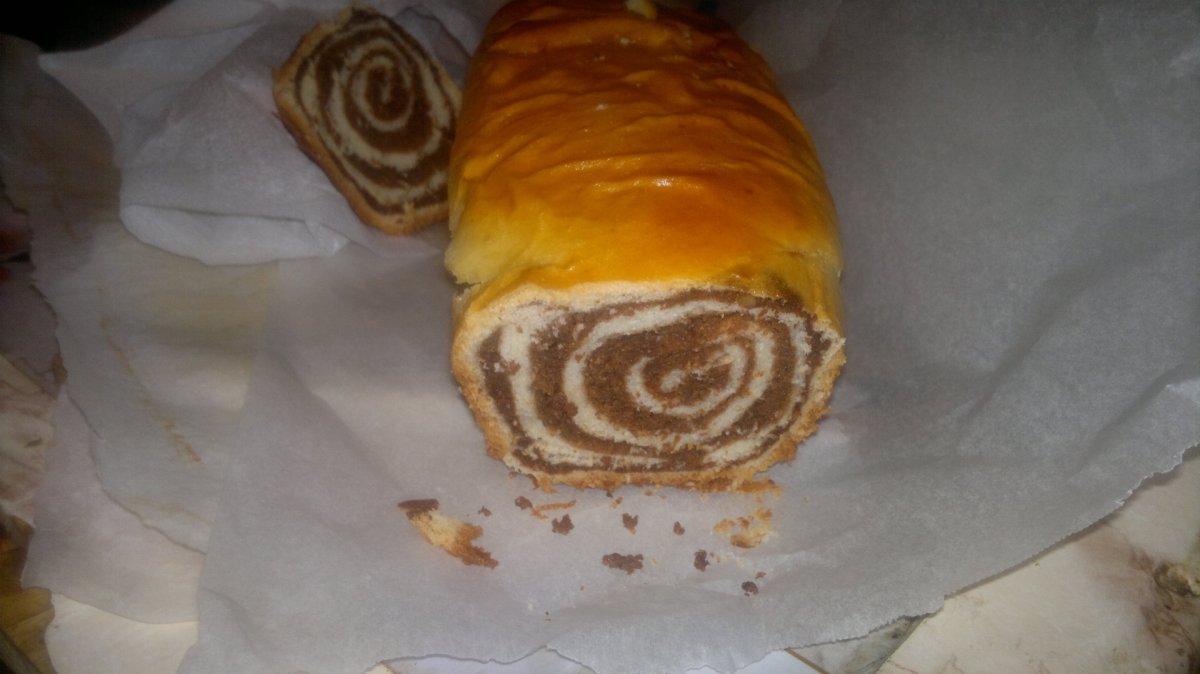 Cand a crescut maiaua amesatecam totul cu restul fainii, adaugam si ouale batute, laptele si esenta de vanilie. Framantam totul cu pumnii stransi bagam mainile din cand in cand in putin unt topit si putin ulei aproximativ o ora pana face aluatul niste basicute. Se acopera aluatul cu un prosopel curat si se da la caldura lasand la crescut timp de 1 ora jumate. In acest timp facem crema: amestecam nuca macinata cu albusul ramas eventual daca mai trebuie mai adugam un ou, zahar dupa gust si adaugam stafidele cu esenta de rom, tapeteam si tavile cu hartie de copt.
