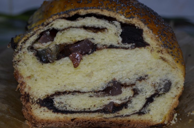 -Se imparte aluatul in patru bucati.Fiecare bucata se intinde foaie pe masa de lucru,se presoara peste foi amestec din cacao cu zahar,se aseaza bucatele de rahat,se ruleaza usor si se impletesc,doua cate doua,apoi se pun in tavile in care s-a pus hartie de copt.Se ung cozonacii cu ou batut,se presoara mac si sa dau la cuptorul incalzit deja,la foc potrivit,pentru circa o ora.Cand sunt rumeni,este semn ca sunt gata copti,se scot tavile si se ung cozonacii cu miere de albine.