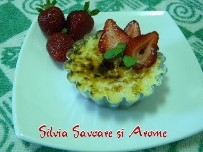 Se pune frisca lichida la incalzit, dar nu trebuie sa clocoteasca, doar sa fie bine calduta. Intre timp, se ameteca galbenusurile cu zaharul pana se obtine o crema pufoasa si zaharul s-a topit. Se adauga lichiorul de migdale, vanilia si sarea. Se amesteca bine. Incet, si foarte putin, se toarna peste crema obtinuta, frisca incalzita. Se toarna compozitia in formele pregatite in prealabil.(in mod normal se folosesc forme de ceramica,insa cum nu am avut,am folosit forme de tarta si 3 pahare de yena) In tava se toarna apa fierbinte sa acopere jumatate inaltimea formelor, si se dau la cuptorul preancalzit la 150gC, pentru 40-45 de minute, sau cand capata o culoare aurie.Se scot din cuptor si se lasa la racit 4-5 ore,de preferabil pana a doua zi. Se presara zahar pe fiecare forma si se caramelizeaza zaharul cu ajutorul unei lampi speciale de bucatarie. timp de 8-10 secunde, avand grija sa nu se innegreasca zaharul.Sau se pot caramelize asezand bolurile sub grill (focul in cuptor sa vina de sus) cam la 10 cm distanta de flacara. Lasam pana zaharul capata o culoare auriu-maronie,nu le lasati mai mult de 1-2 minute sa nu se arda zaharul prea tare.