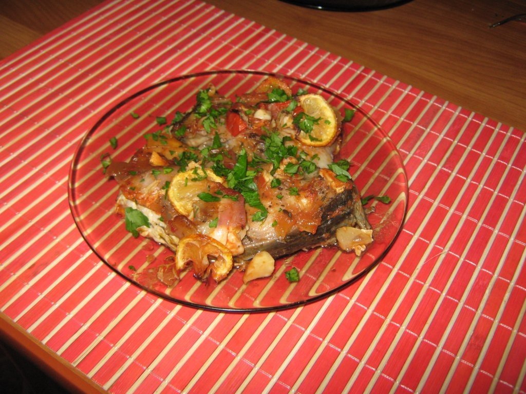 Se curata pestele si se spala bine.Legumele spalate si taiate felii.Ungem un vas termorezistent cu ulei si punem un strat de morcovi taiati rondele.Pestele il condimentam cu sare si piper si il punem peste stratul de morcovi. In interior punem 2-3 felii de rosii , 1 felie de ceapa si 2 felii de lamaie.Restul legumelor le asezam frumos pe langa peste si deasupra.Stropim cu putin ulei de masline si bagam la cuptor pentru aprox 30 min.Serviti cu mujdei de usturoi si mamaliguta.