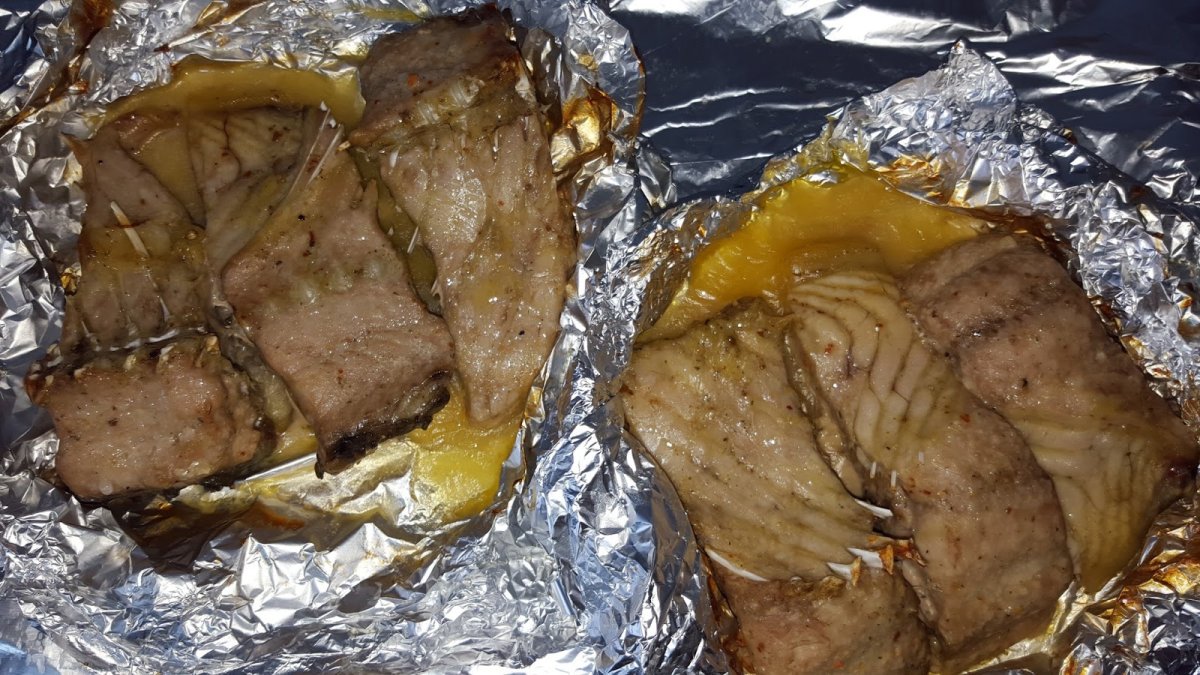 Pestele portionat se unge pe ambele parti cu putin ulei si condimente si se da la rece cateva ore. Ungem o foaie de aluminiu cu ulei de masline, asezam cate 3 buc de peste si-i ungem si pe deasupra. Punem lamaia peste. Strangem folia pachet si intoarcem marginile pliate in sus sa nu se scurga zeama in tava. Dam la cuptor la 200 de grade timp de 30 de minute, desfacem folia si mai lasam 5-10 minute sa se rumeneasca putin. Puteti servi cu lamaie sau sos din legume coapte : blenduim rosii, ardei capia si usturoi coapte si le amestecam cu ulei de masline, sare si patrunjel tocat.